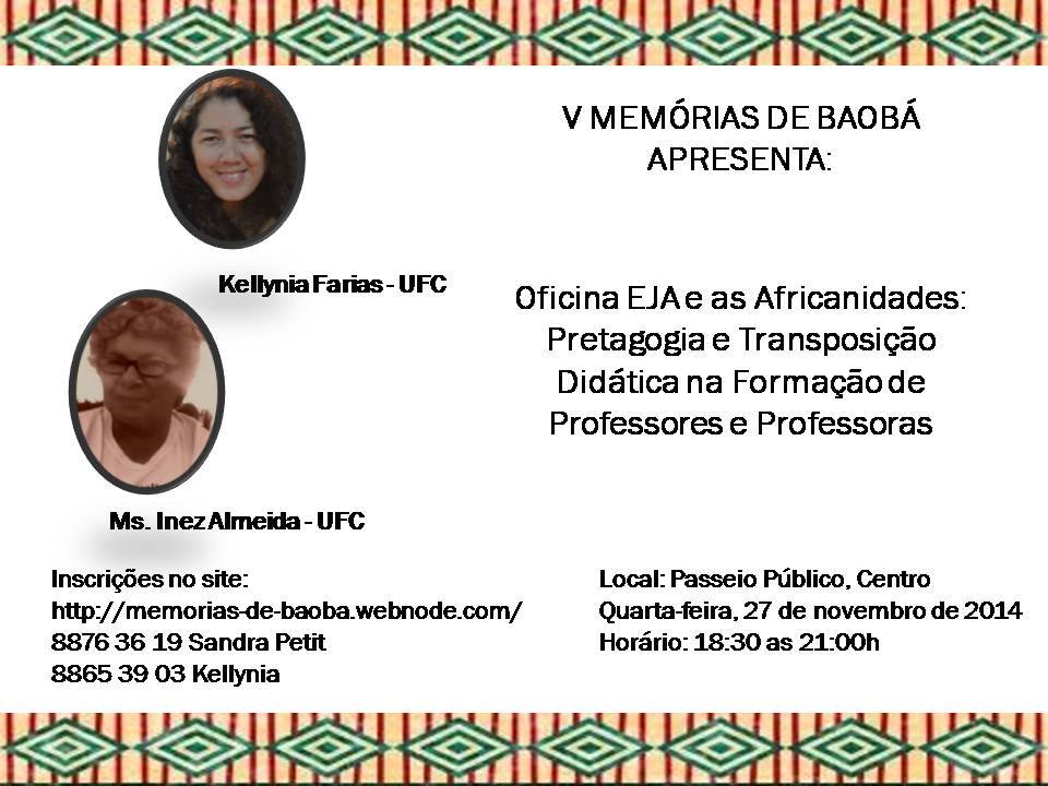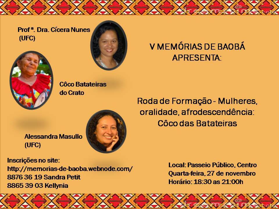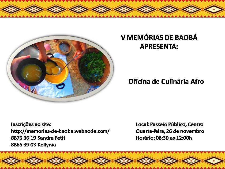 O V Memórias de Baobá, apresenta aqui as oficinas, mini cursos e rodas de formação. Essa variedade de atividades, linguagens e vivências é uma amostra de quão complexa é cultura afrobrasileira .
